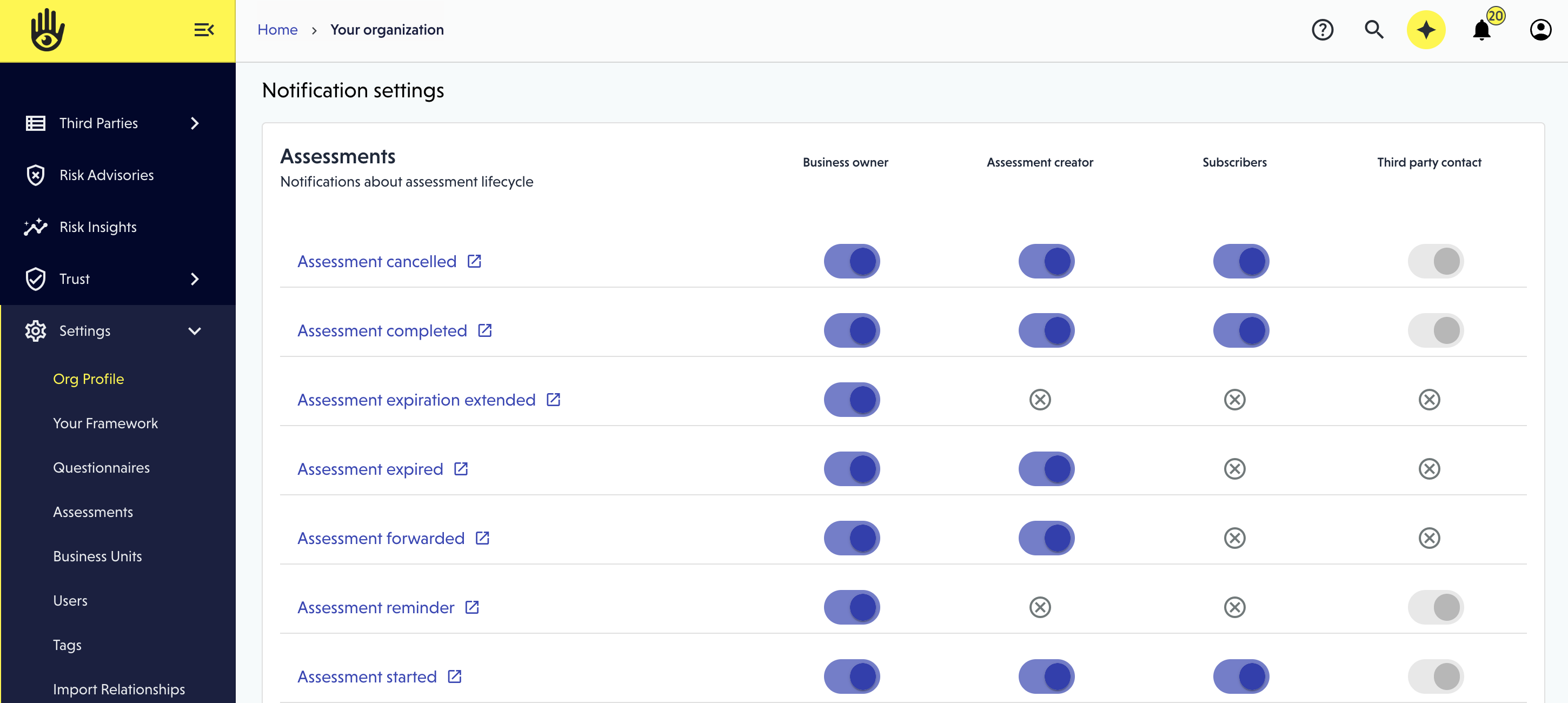 Org Admins have powerful tools to manage how and where notifications are delivered across the VISO TRUST platform. This flexibility ensures the right people stay informed without overwhelming inboxes.