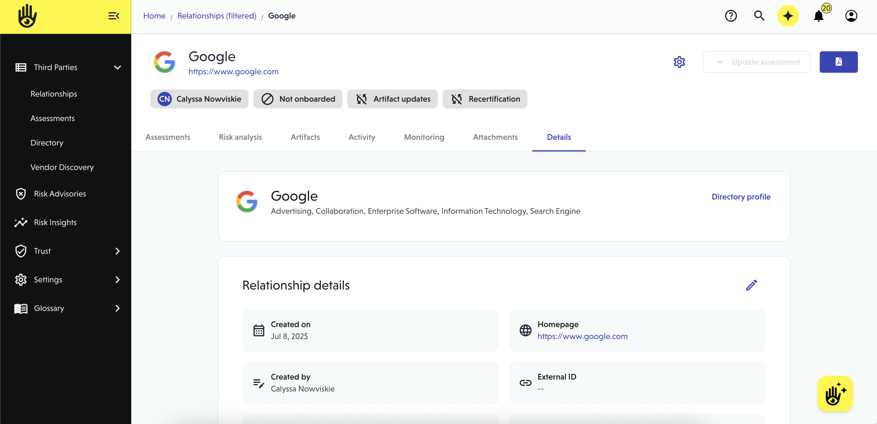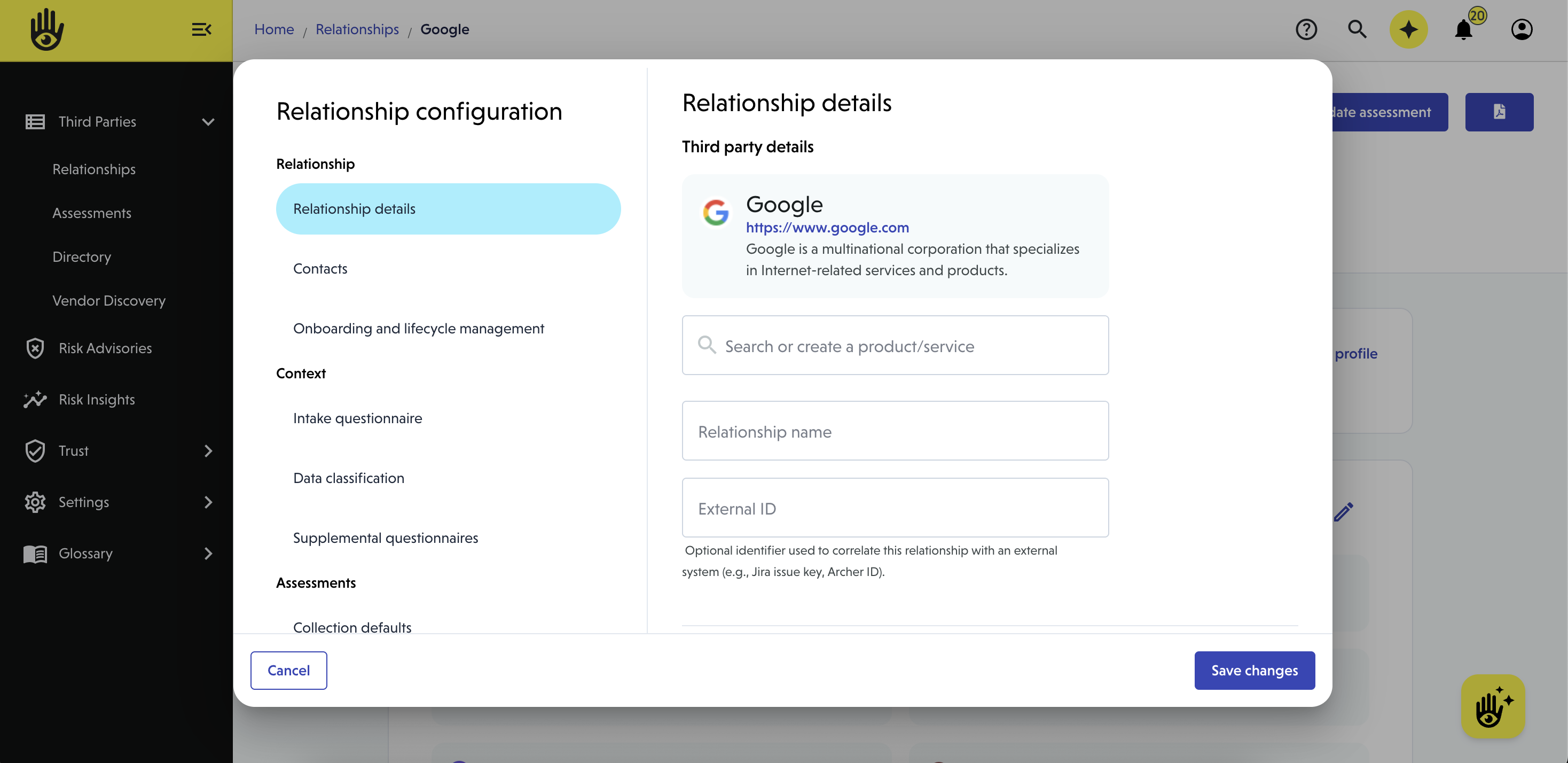 Relationship configuration lets you define how a vendor is managed, assessed, and monitored over time. This includes who owns the relationship, what data is involved, and how assessments should run.