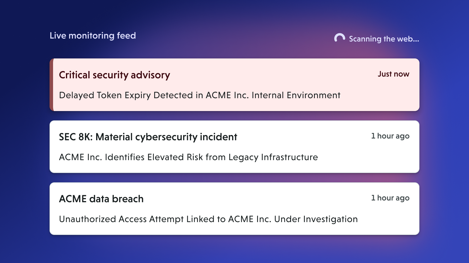 Monitoring TabSurfaces risk advisories and events discovered from public web monitoring. This includes security incident disclosures, breach reports, or other publicly posted risks associated with the vendor. | ![]() |