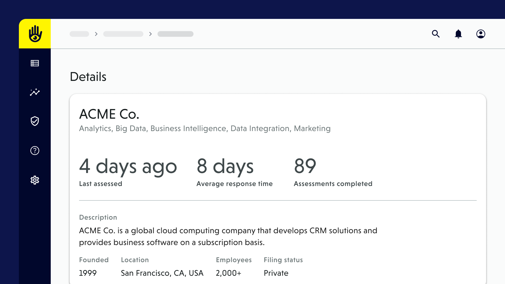 Details TabIncludes company metadata, domains, firmographics, and other foundational vendor details. | ![]() |