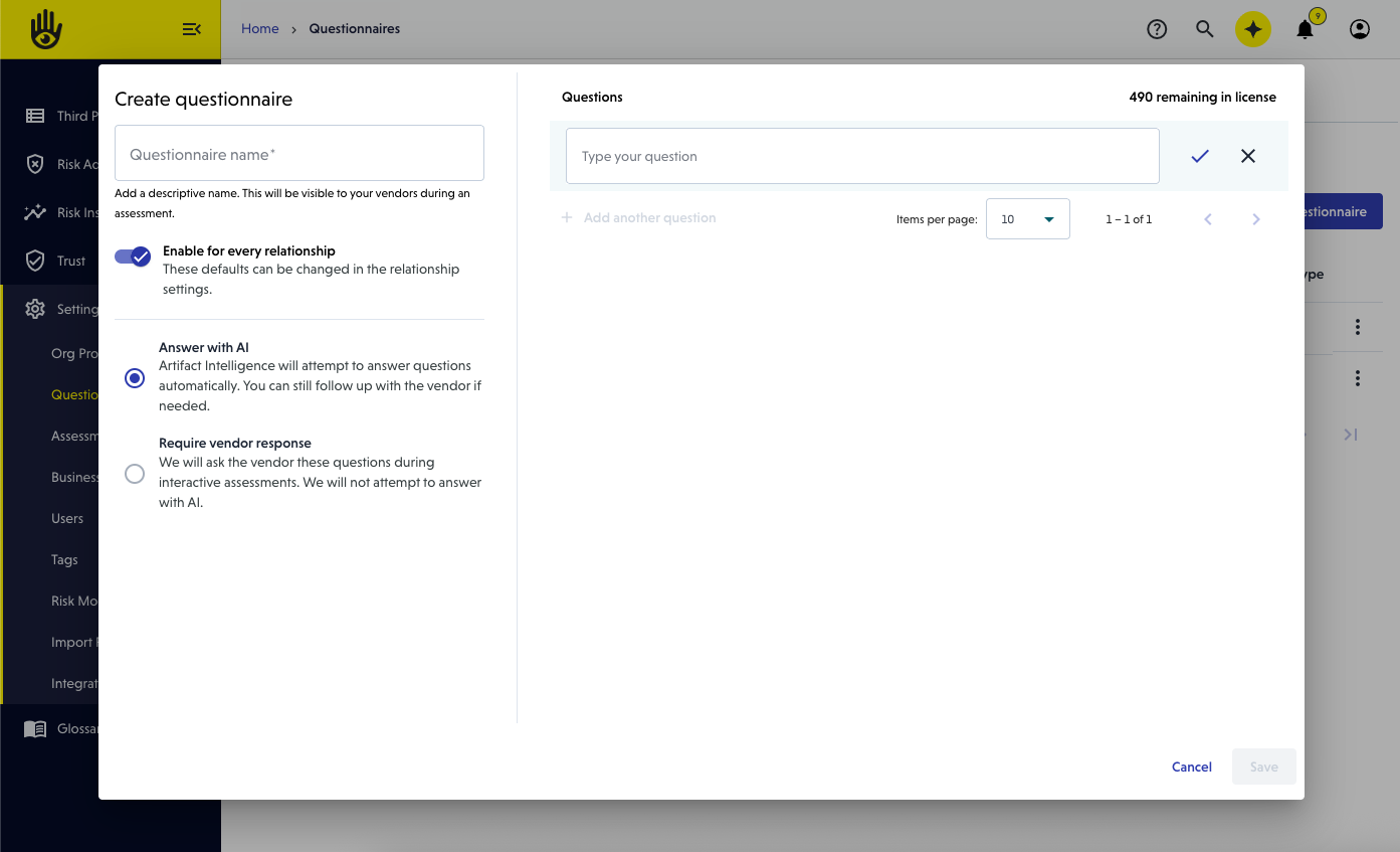 When creating or editing a questionnaire, you can now choose how responses are collected — either automatically by Artifact Intelligence (AI) or directly from the vendor.- Answer with AI