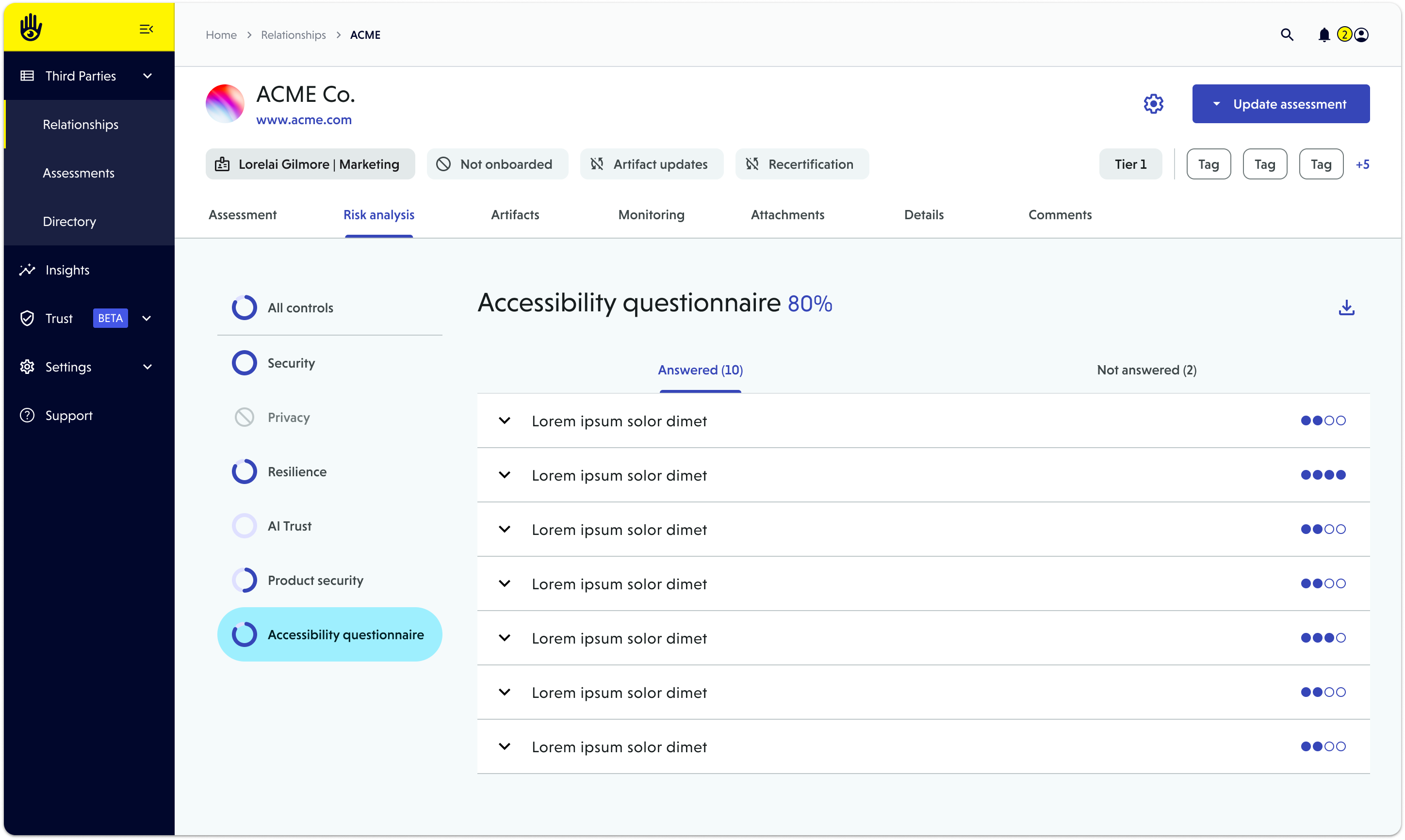 - Review responses in the Risk Analysis tab of the Relationship Details Page.