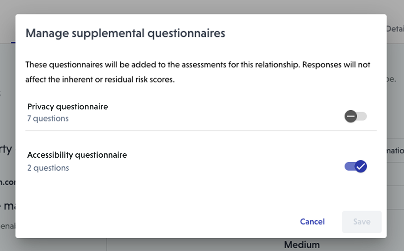 - When enabled for a relationship, questionnaires are included in the scope of assessments.