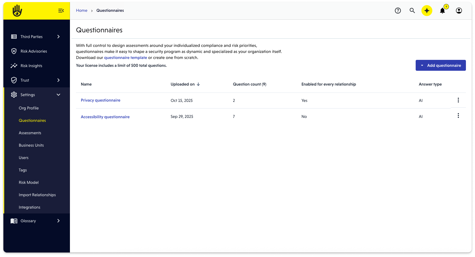 We recommend choosing a descriptive name. This will be visible to your vendors during an assessment. - (Optional) Enable for every relationship.