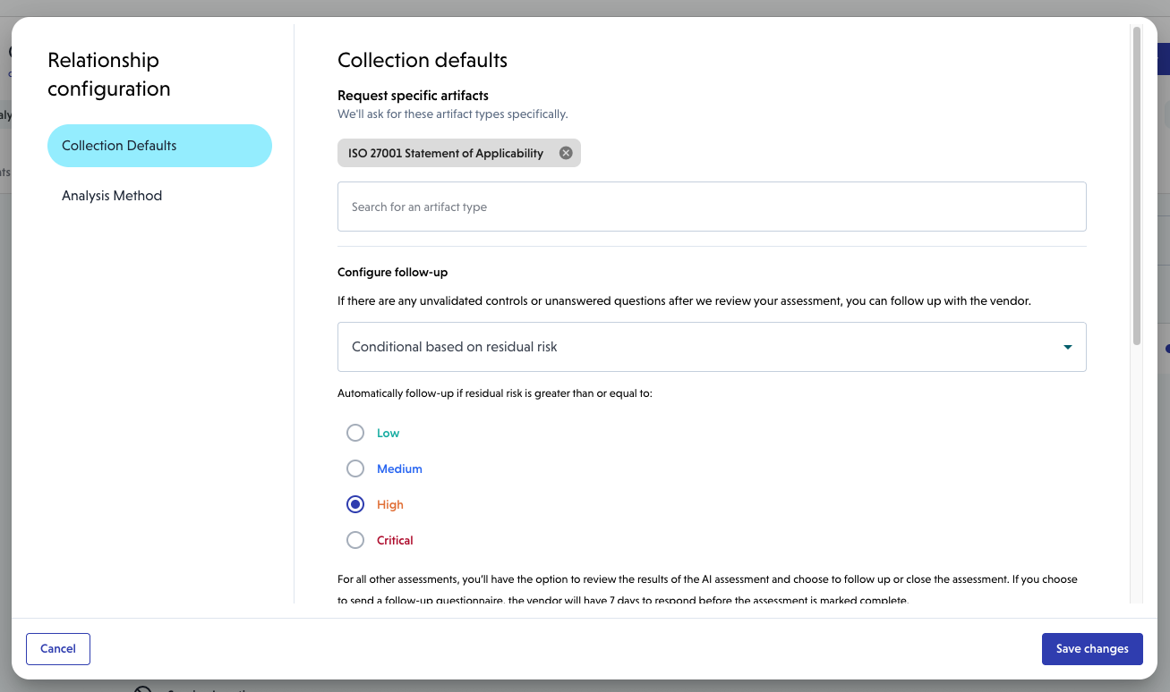 • Conditional based on residual risk: set a threshold based on residual risk to automatically follow up. For example, follow up with the vendor if residual risk is greater than or equal to Medium. For all other assessments, youโ€™ll have the option to review the results of the AI assessment and choose to follow up or close the assessment.