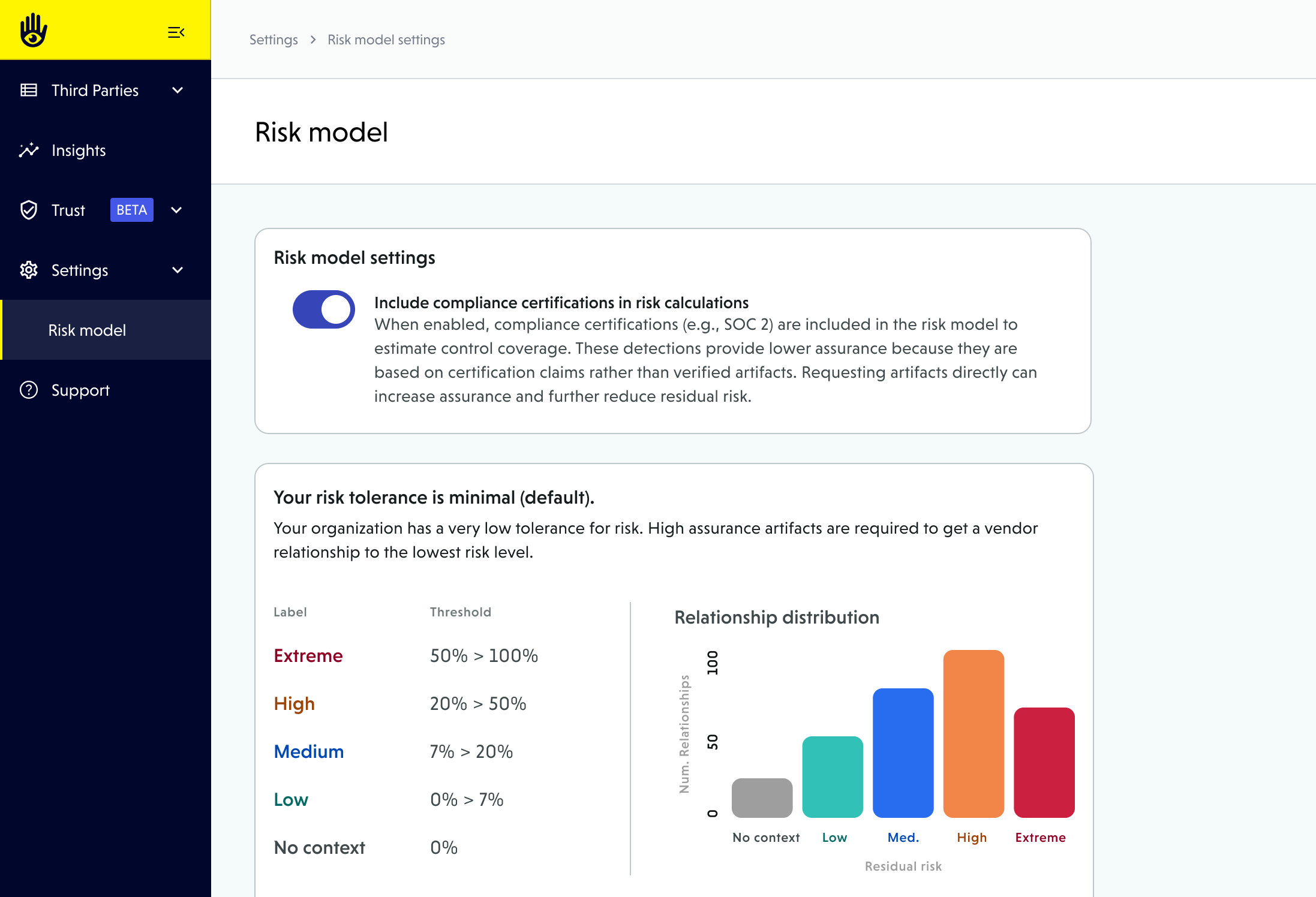 - Certifications like SOC 2 and ISO 27001 are included in risk calculations as partial control coverage.